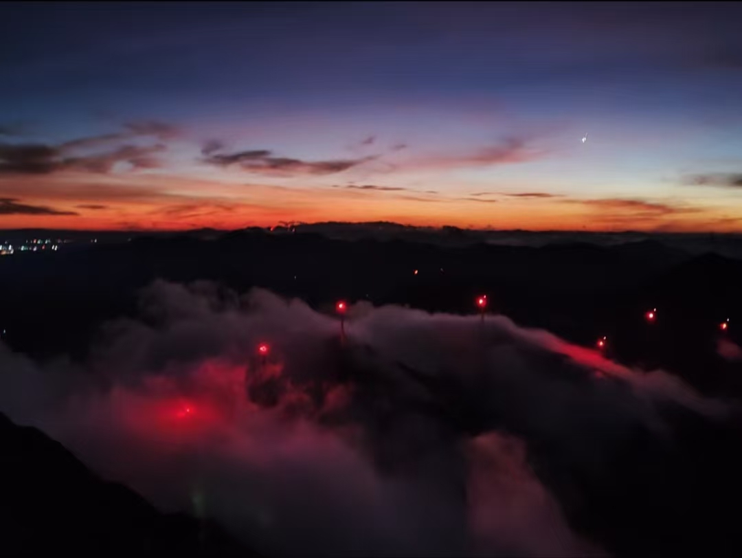 暮色弥漫,天空晕染着绚丽色彩,云雾间绯红色光芒闪烁,似梦幻之景